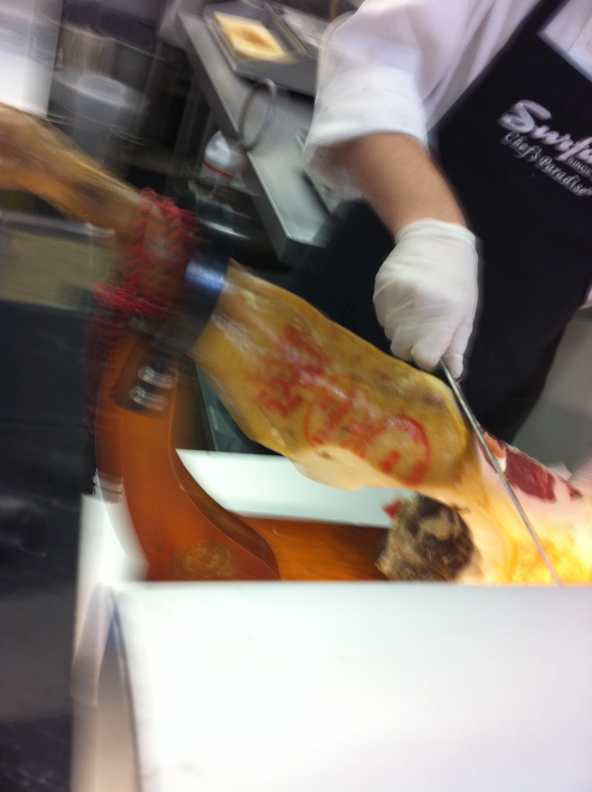 It is, indeed, the most expensive ham in the world — I pay $135 a pound for it, and am grateful for the privilege. I don’t buy it often, and usually get a quarter pound for $35. It’s plenty. You might have trouble finding this stuff. If I were you, I would make like a detective and do whatever you had to do to pick up its trail. If you live in L.A., I get mine at Surfa’s in Culver City. You could likely get it at the Spanish Table in Seattle (I know there’s a few of you out there). Probably Dean & DeLuca’s or someplace like that in NYC. You could buy a whole one online from tienda.com for $1,400. (Let me know… I might go in on it with you.)