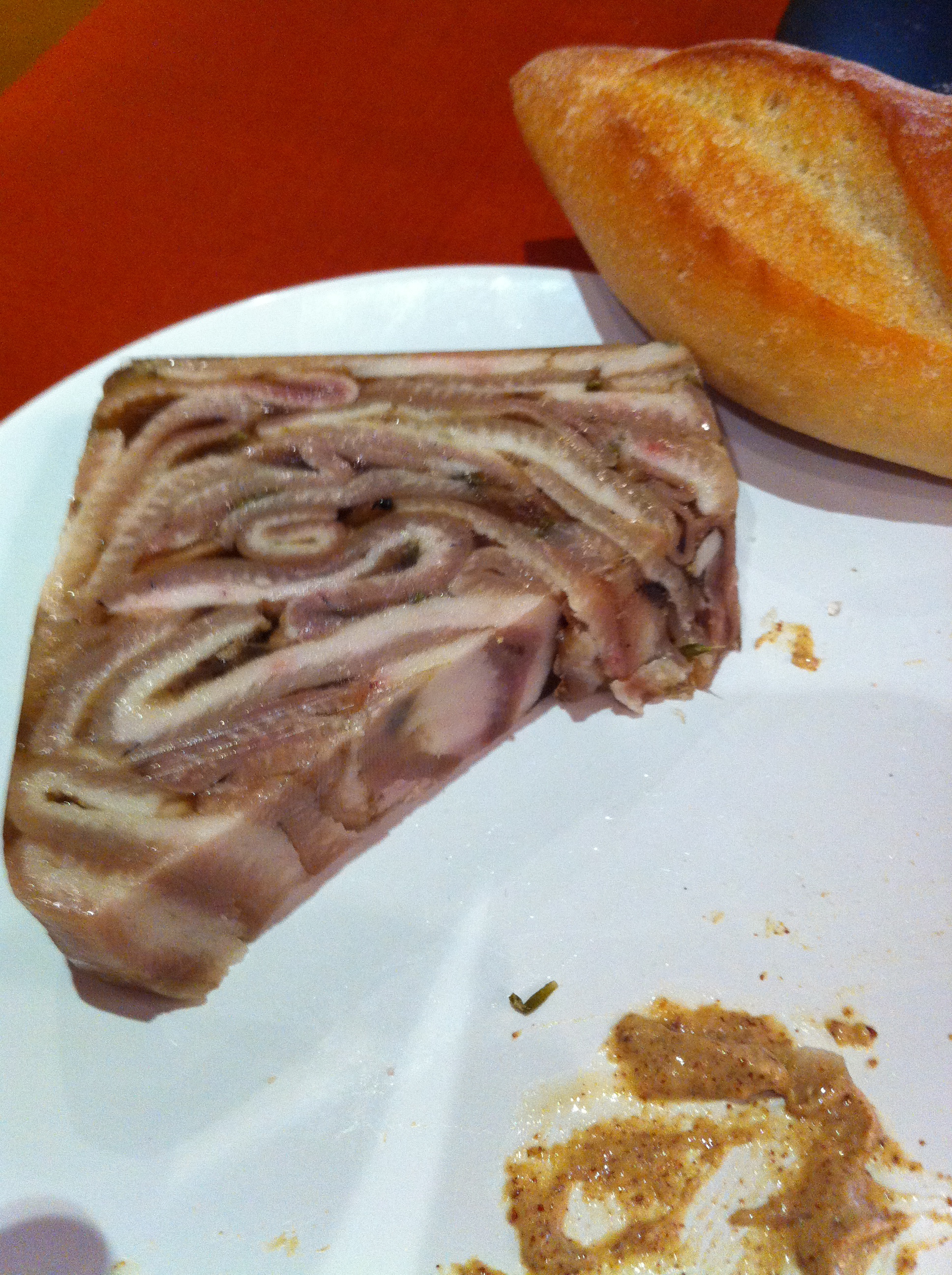 It’s tripe(intestines), people. Made into a terrine of sort. And it doesnt look gross at all, looks delicious.