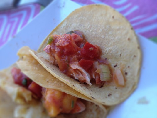 To make tacos, take a few ounces salmon meat per taco. Place in center of tortilla, and spoon a tablespoon of salsa over each. Squeeze a little lime over the top and serve.