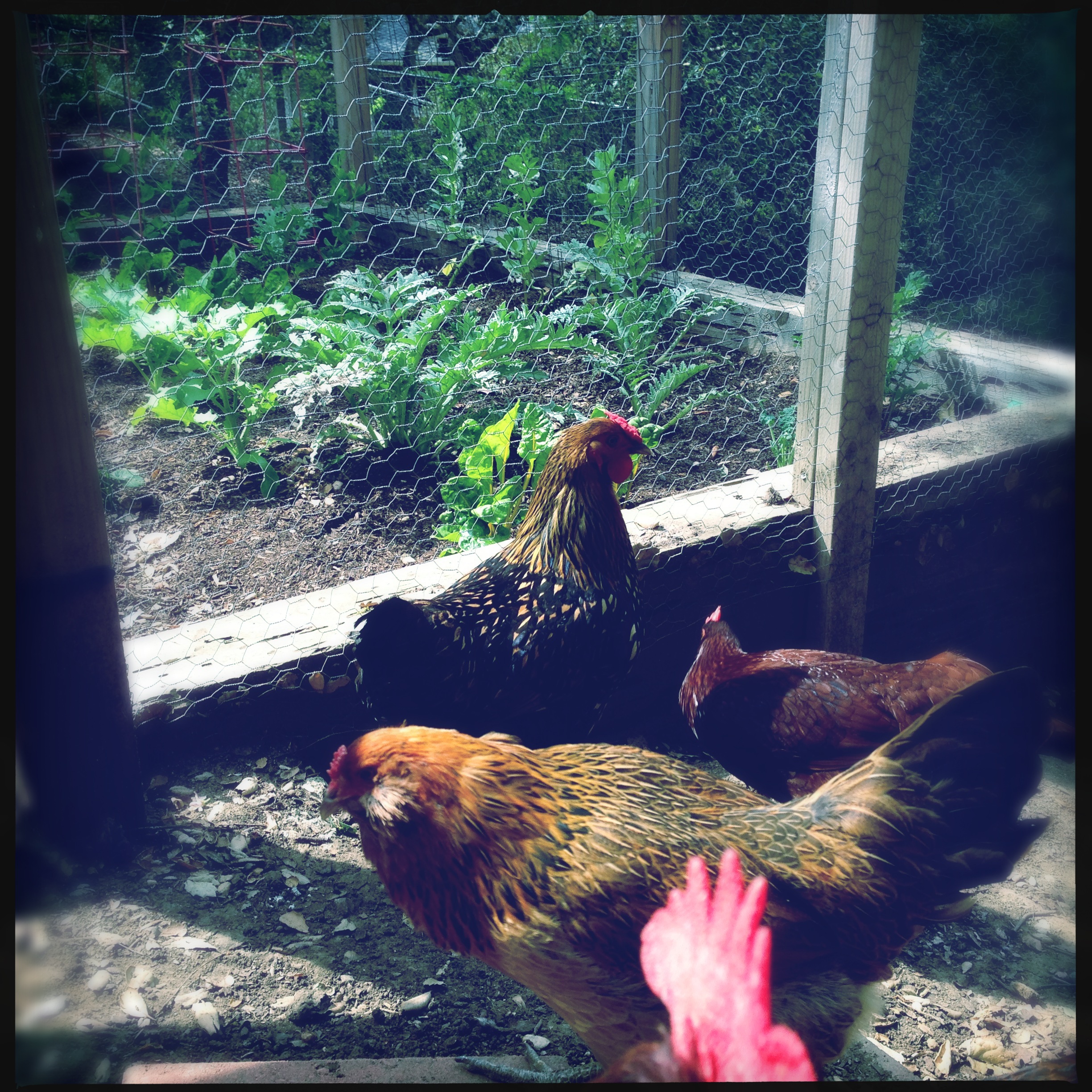 Preparations for this year’s garden included fortifying it against one of last year’s greatest foes — the chickens. The very first year I put terraces in on our back hillside, it was a lost cause — the hens took over, scratching, rolling in the soft soil, sunning themselves, and nibbling young greens until nothing was left but stem. So I fenced the enclosure in. But while not acrobatic flyers, the most athletic of the chickens soon figured out they could fly up and over. So this year I extended the height another few feet with additional chicken wire. Even still, every so often I inexplicably find a chicken inside.