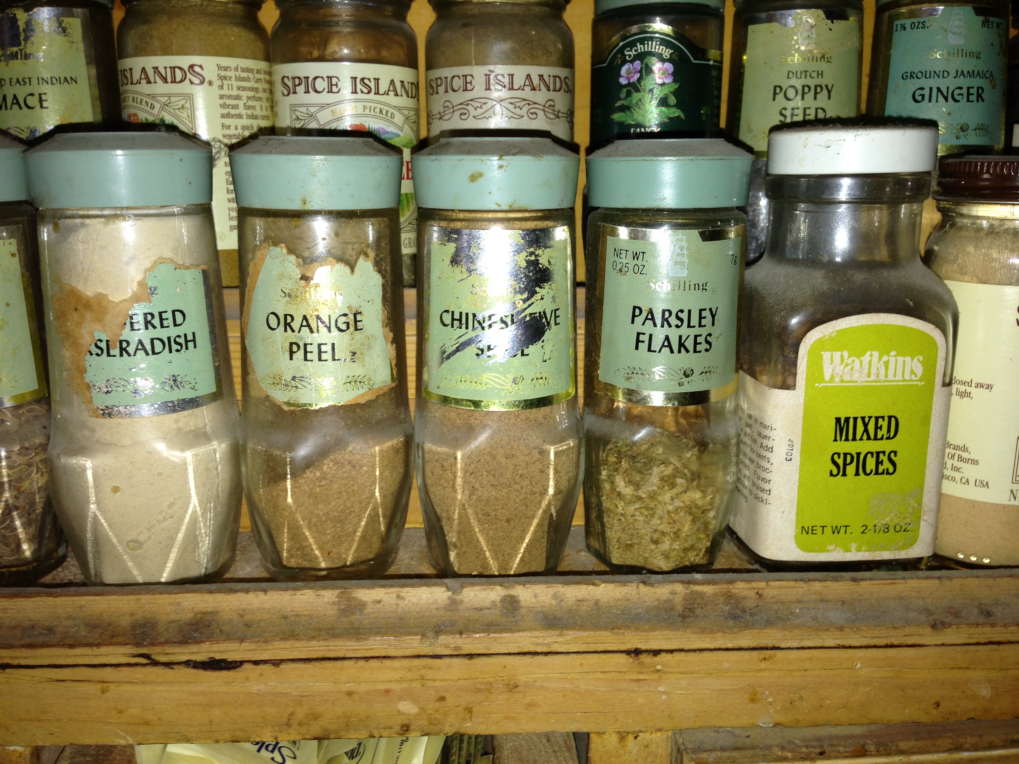 The next time I went out to my dad’s house to pick him up for lunch, I decided to investigate. A wave of nostalgia washed over me as I approached the rack — there they were! The spices of my childhood! The first thing to catch my eye were the Spice Islands jars — those were the newer ones when I was young, the ones I actually cooked with. Mixed in among them were the ones that brought me way, way back — the pale sage green labels and groovy fonts of the Schilling jars. There was mace and orange peel, poppy seed, grayish parsley flakes, powdered horseradish. Some were so old the color and names had been brushed away, leaving only a silver under-label and the unknown remains of whatever had once been living inside.