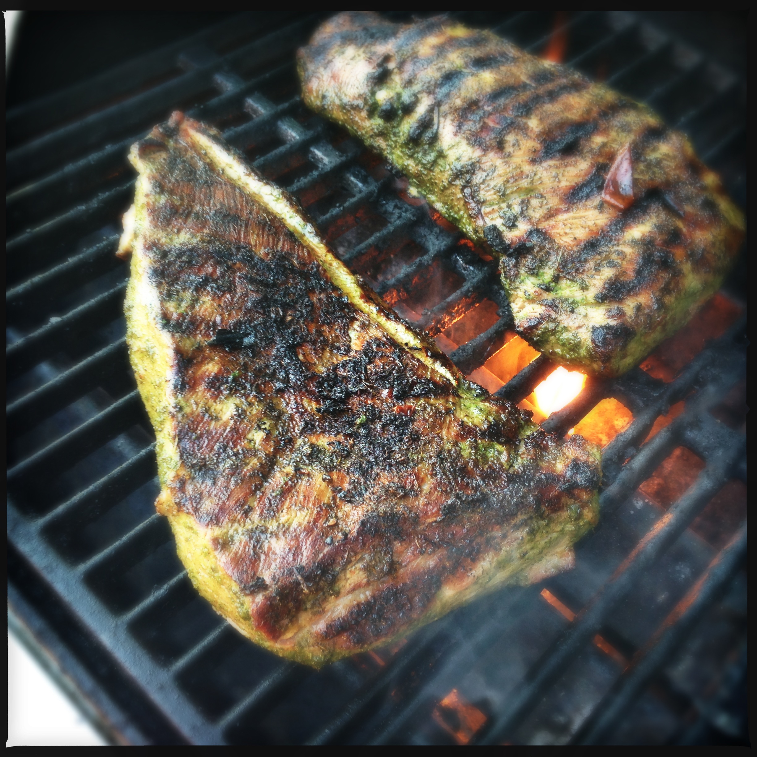 Somewhere in the middle of all that, I connected with pal Ernie about what we would be grilling the afternoon of the 4th, and he told me he had two tri tips in the fridge that he would be bringing up. They were sitting pretty in parsley, thyme, rosemary, sage, garlic, salt, pepper and olive oil.