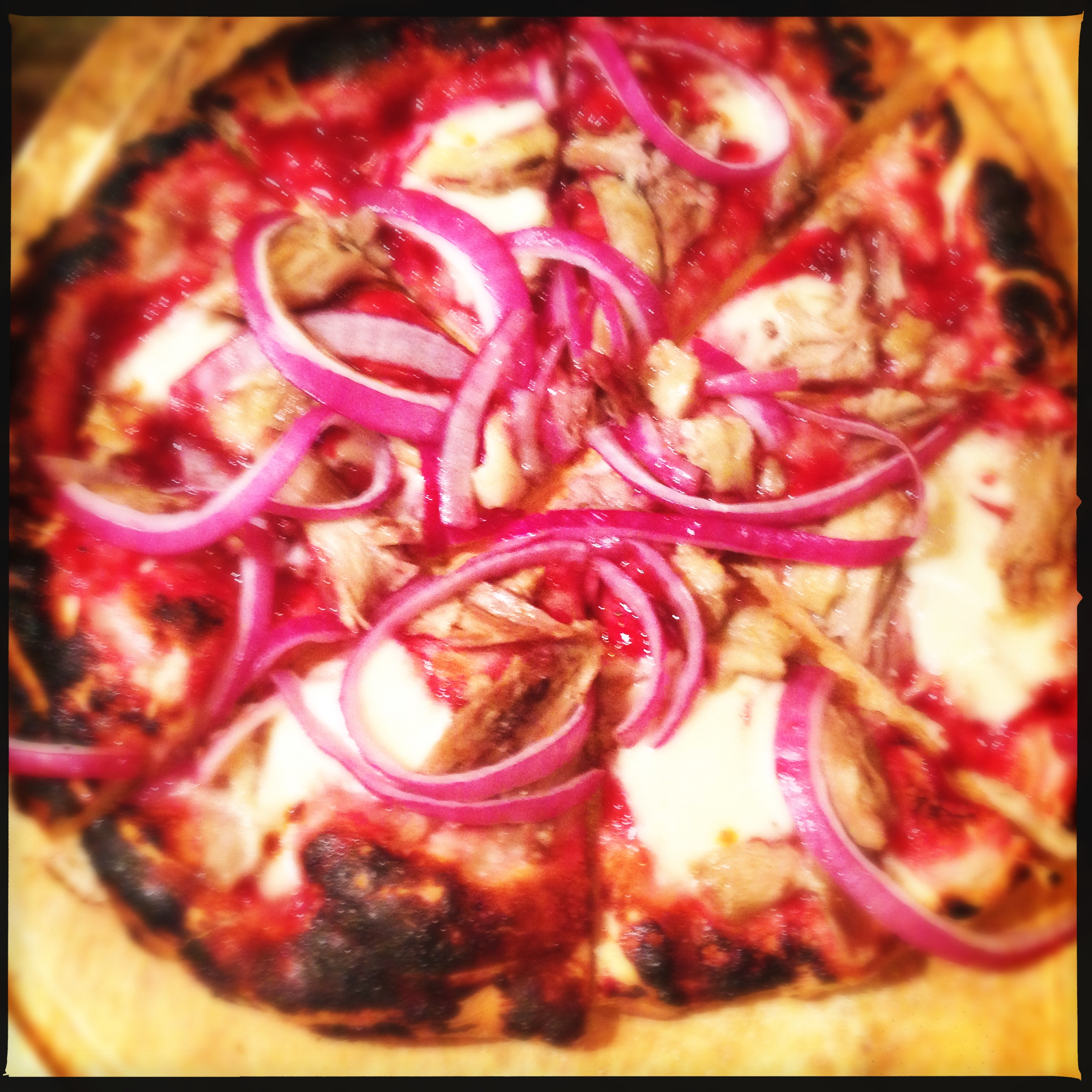 Pizza with homemade Chinese plum sauce, duck confit and red onion