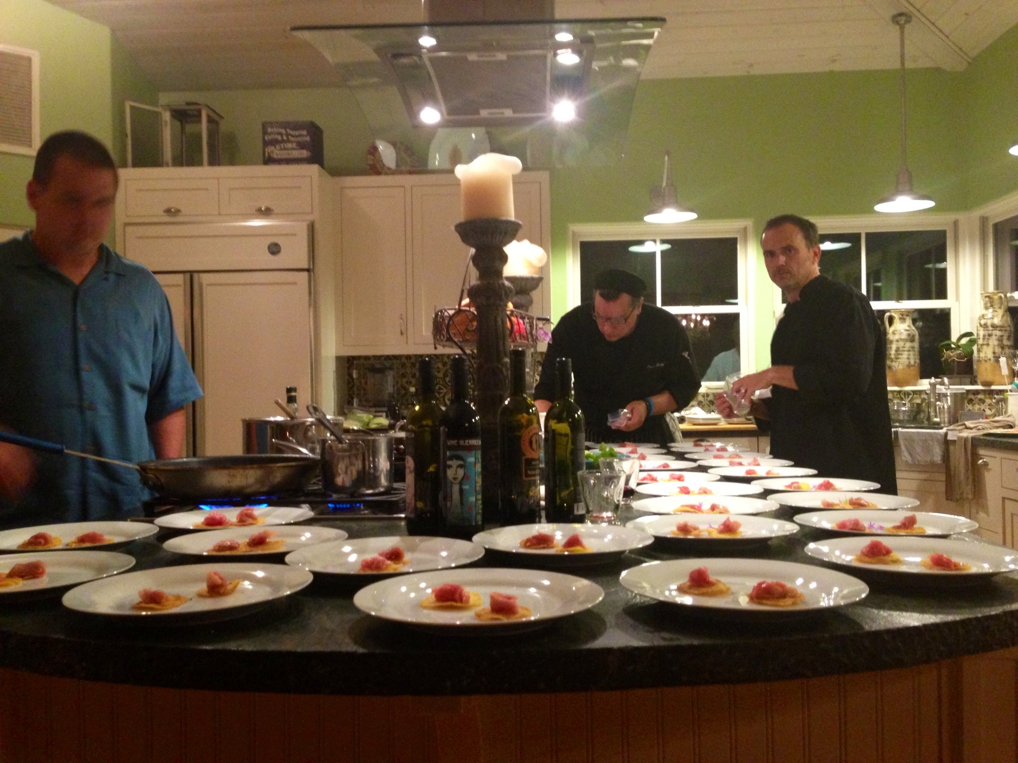 The evening was warm and breezy, the tables set with exquisite care by our very talented friend, Catherine, buoyed by the ineffable presence of our delightful neighbor and all-purpose assistant, Angela. There was a long table outside by a fountain seating 12, several other al fresco tables on a patio outside the main dining room, where another large table sat another 12. Two tables in the kitchen sat an additional 12. The first guests came at 6:10, by 7 p.m. only a few had yet to arrive. We seated everyone and the food began emerging from the kitchen.