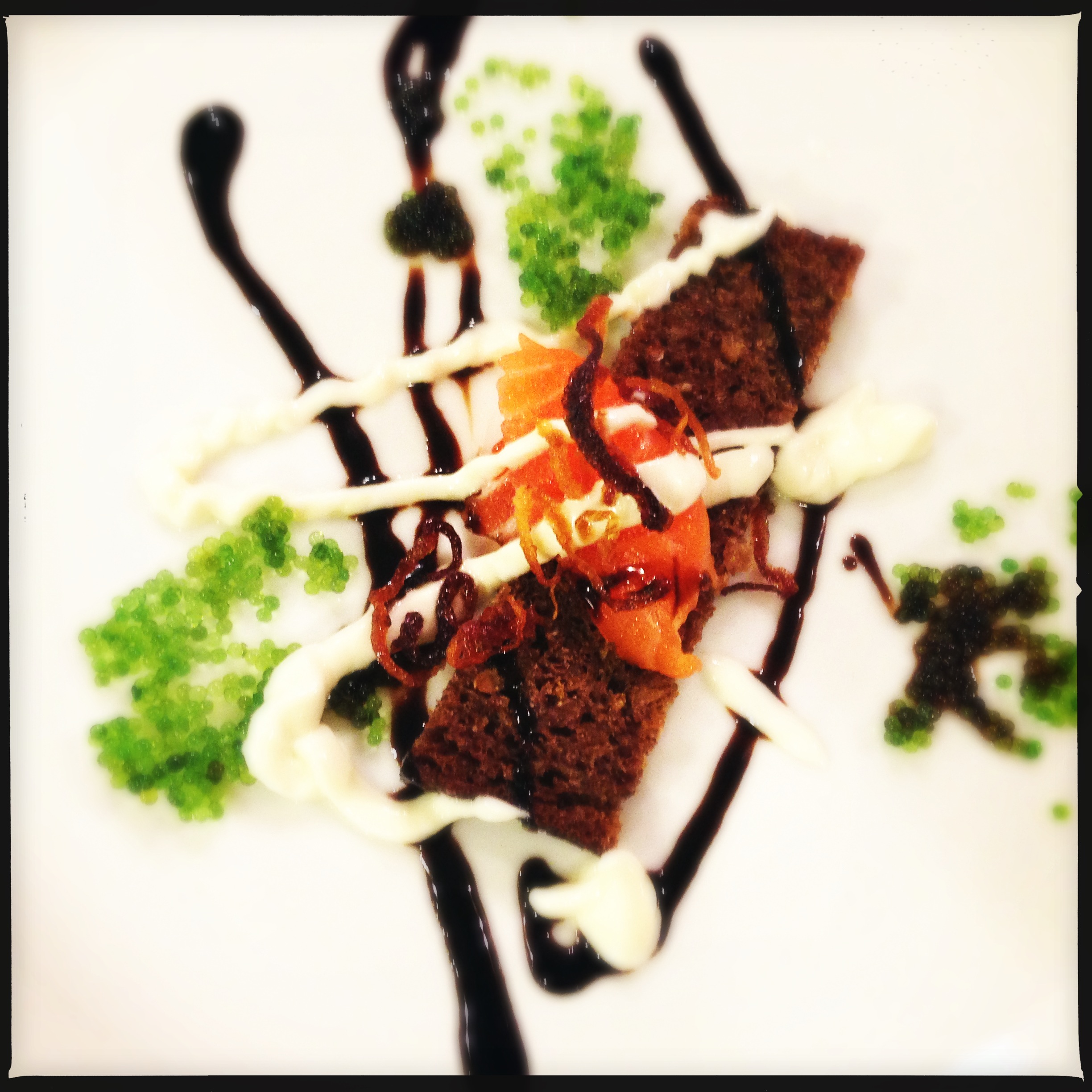 Toast your pumpernickel, and then cut each slice into four triangle “points”. Arrange a few toast points on each plate, and then make a rose of a couple slices of the vodka-cured salmon and place on top of each toast point. Continue until you’ve used up all the salmon and each toast point has salmon on top.
