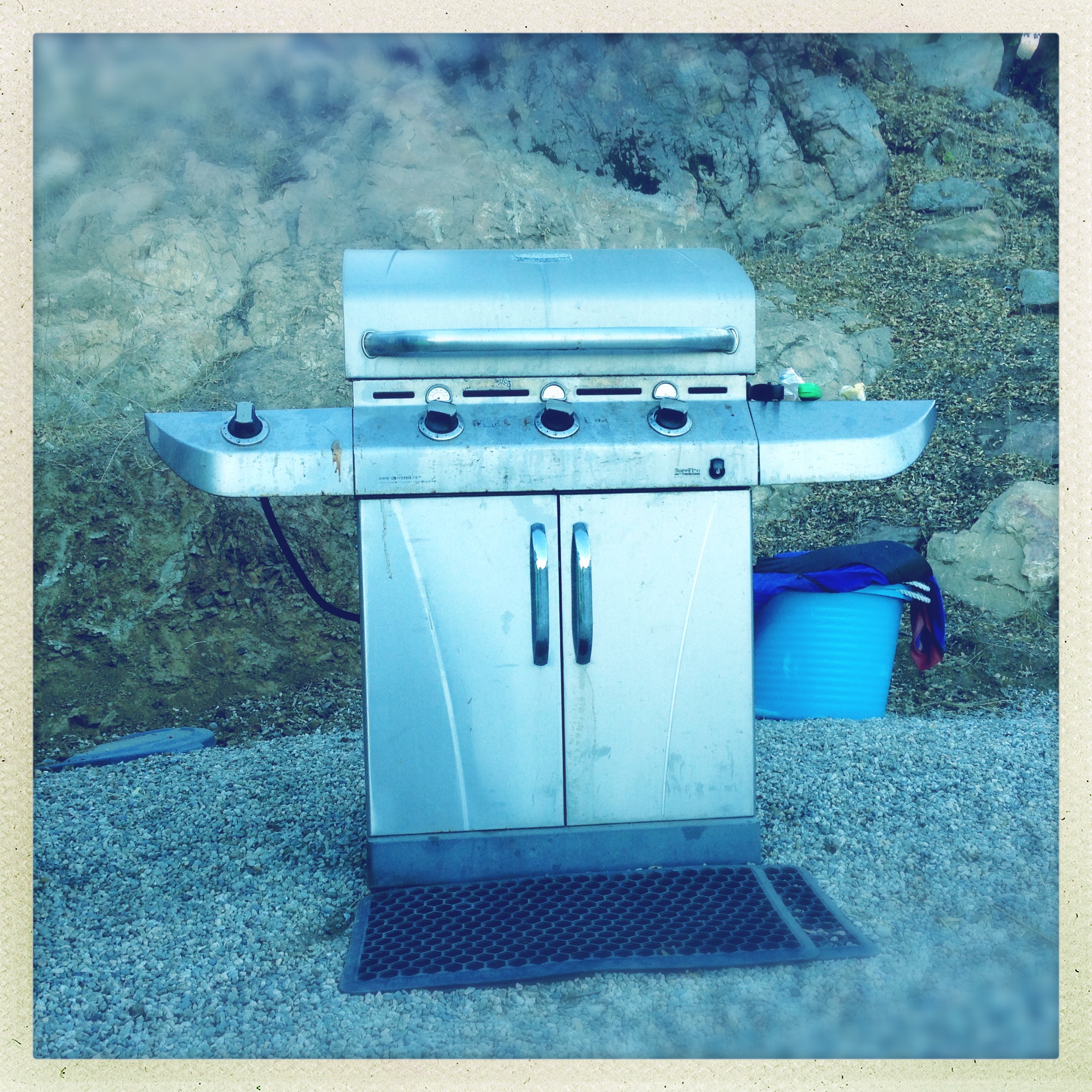 As the sun dipped behind the mountain behind us, the time was right for starting the cooking. I refilled my wine glass and repaired to the “chuckwagon circle,” the grub hub, to put fire to meat. Unfortunately, the grill had other ideas.
