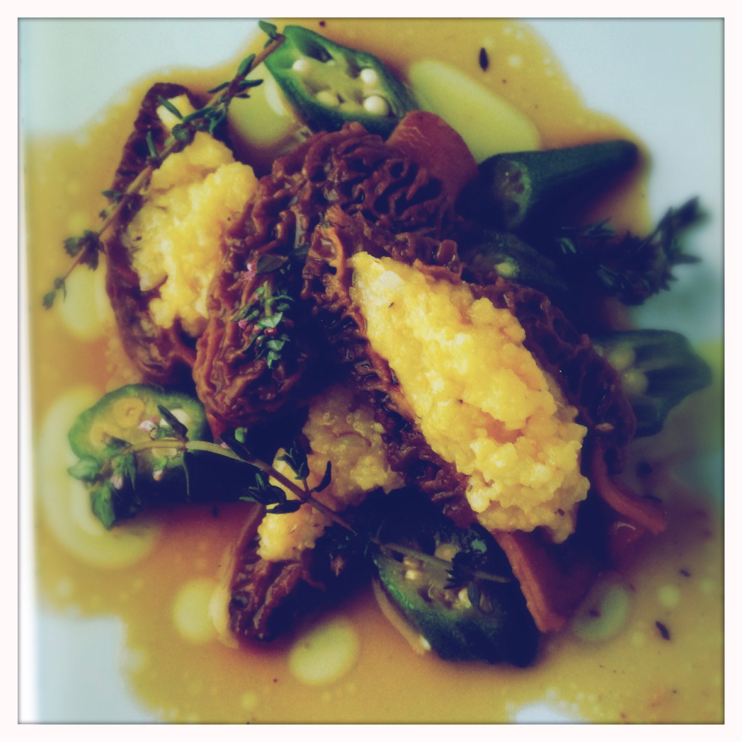 Charlie Trotter’s morels with yellow corn grits, okra and morel juices