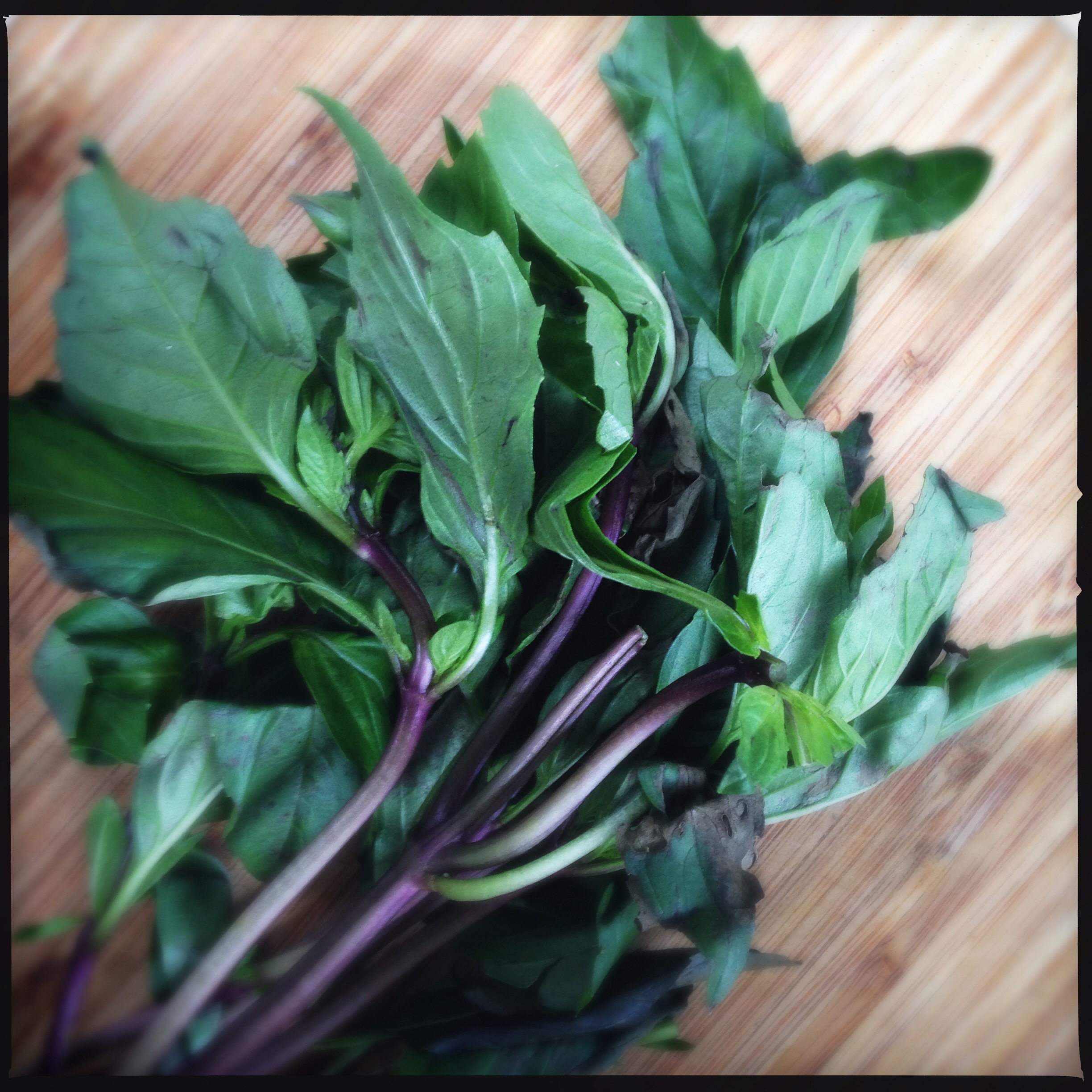 Thai basil is different than Italian basil. When you hold it in your hands and then smell it on your fingers, it evokes not vineyards and villas but temples and tuk tuks. It’s scent is exotic and sultry. Because it is spicy and insistent, I find it less useful for the wide variety of applications appropriate to Italian basil. So I made noodles, I used a little for a sauce in my Asian-accented New Years Eve dinner. And still, the bulk of it was left on the bottom shelf in my fridge.