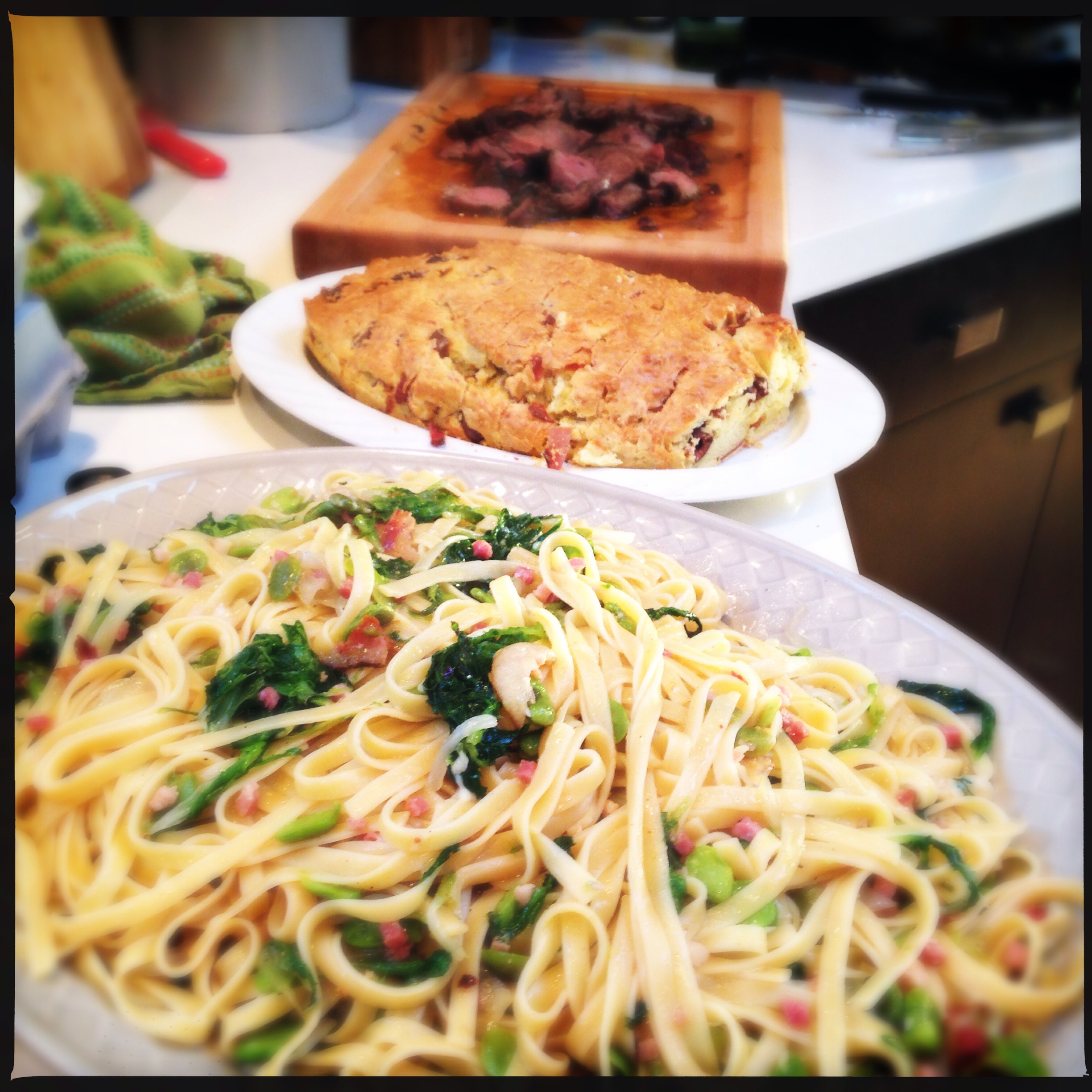 Easter is, obviously, now over. But these are essentially wonderful spring Roman dishes — so you’ve still got time if you’d like to make this fettuccine. I recommend heading the your farmer’s market, seeing if you can track down some escarole and fava beans, and getting to work. If you’ve got fresh eggs and good chicken stock, serve it with stracciatella for a true Roman meal.