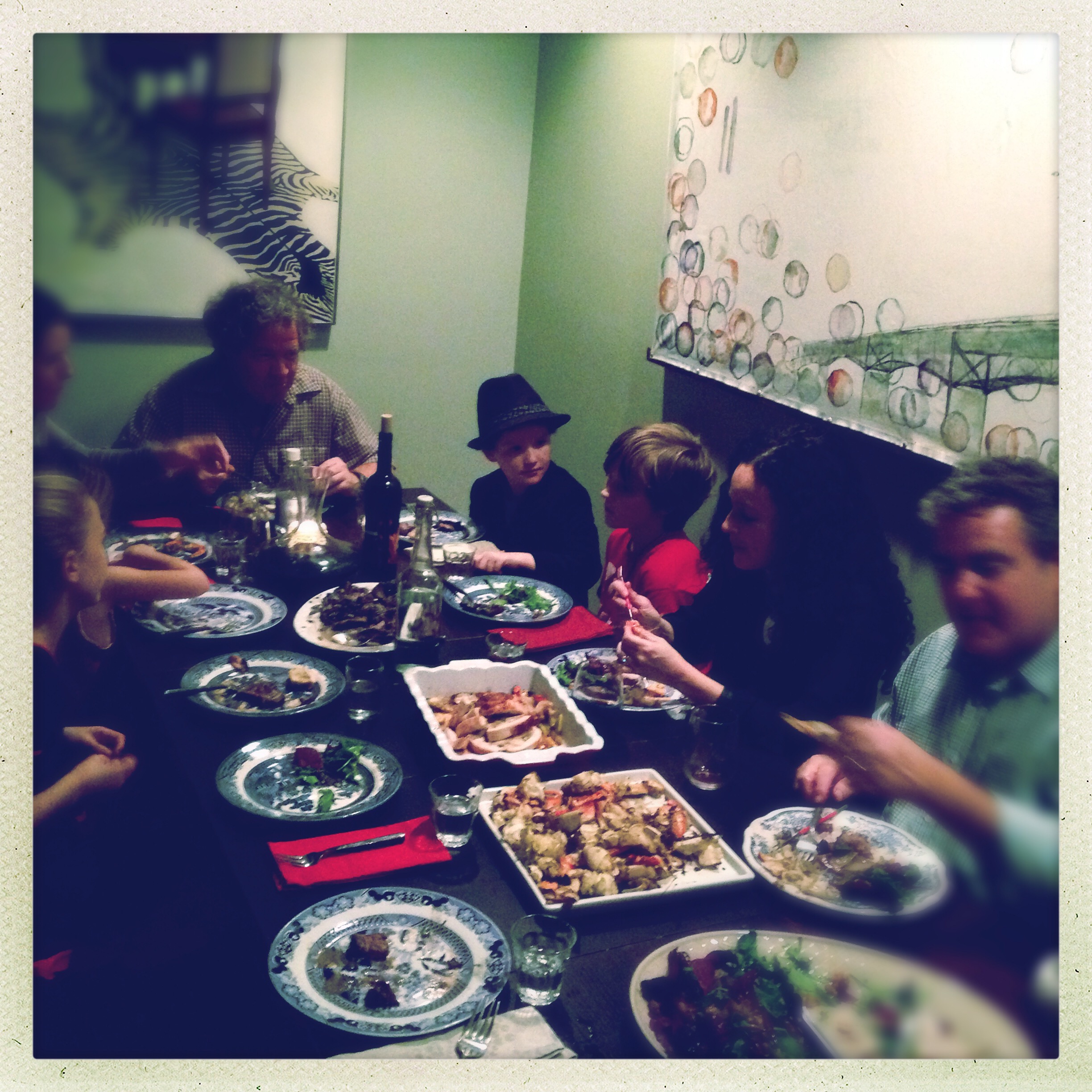Friends are here. Don has shucked oysters, I put out leftover Icelandic rye bread with chocolate stout cheese, wine glasses are filling.