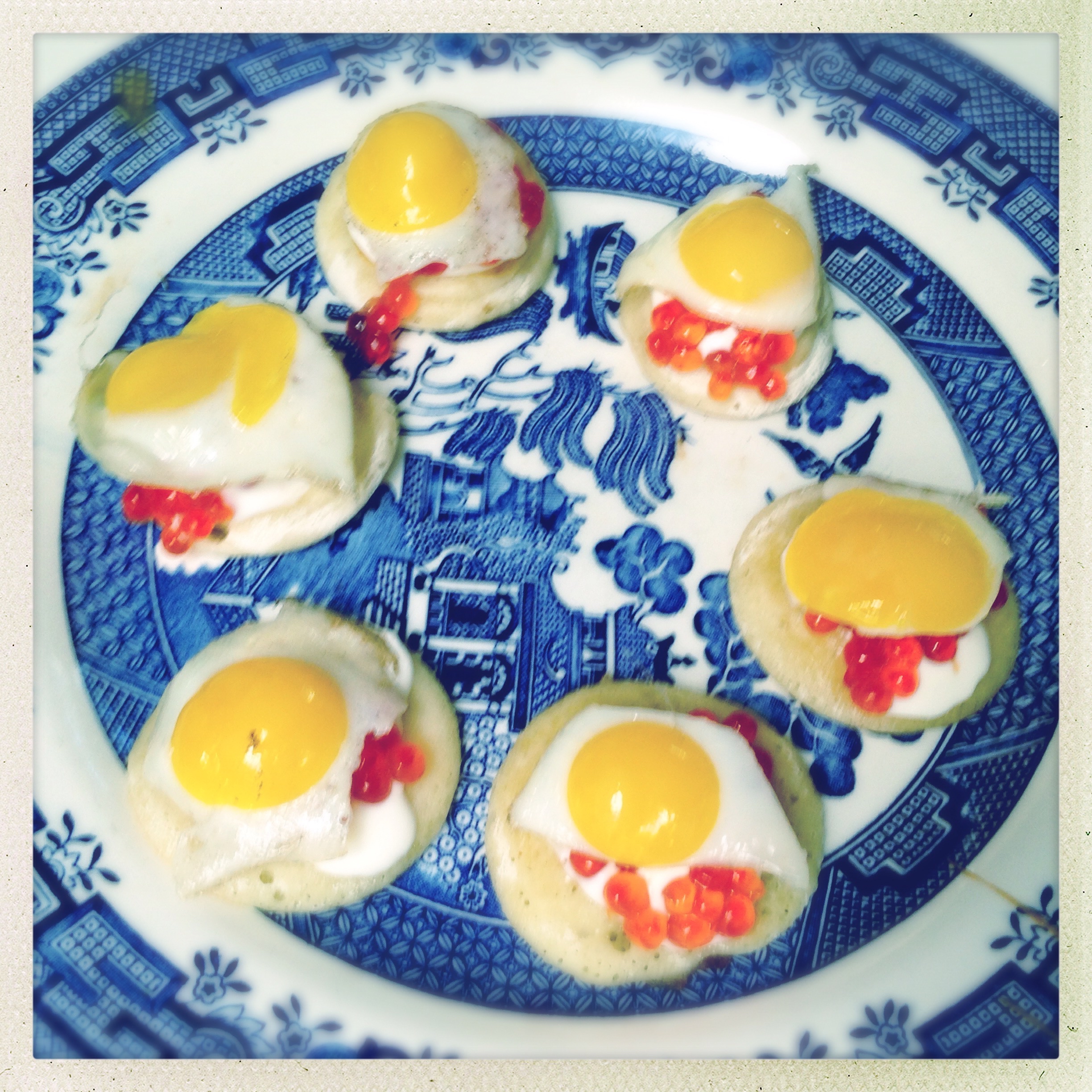 We were sitting around on New Year’s Day drinking bloody marys, when my pal Don showed up with caviar, creme fraiche and blinis.