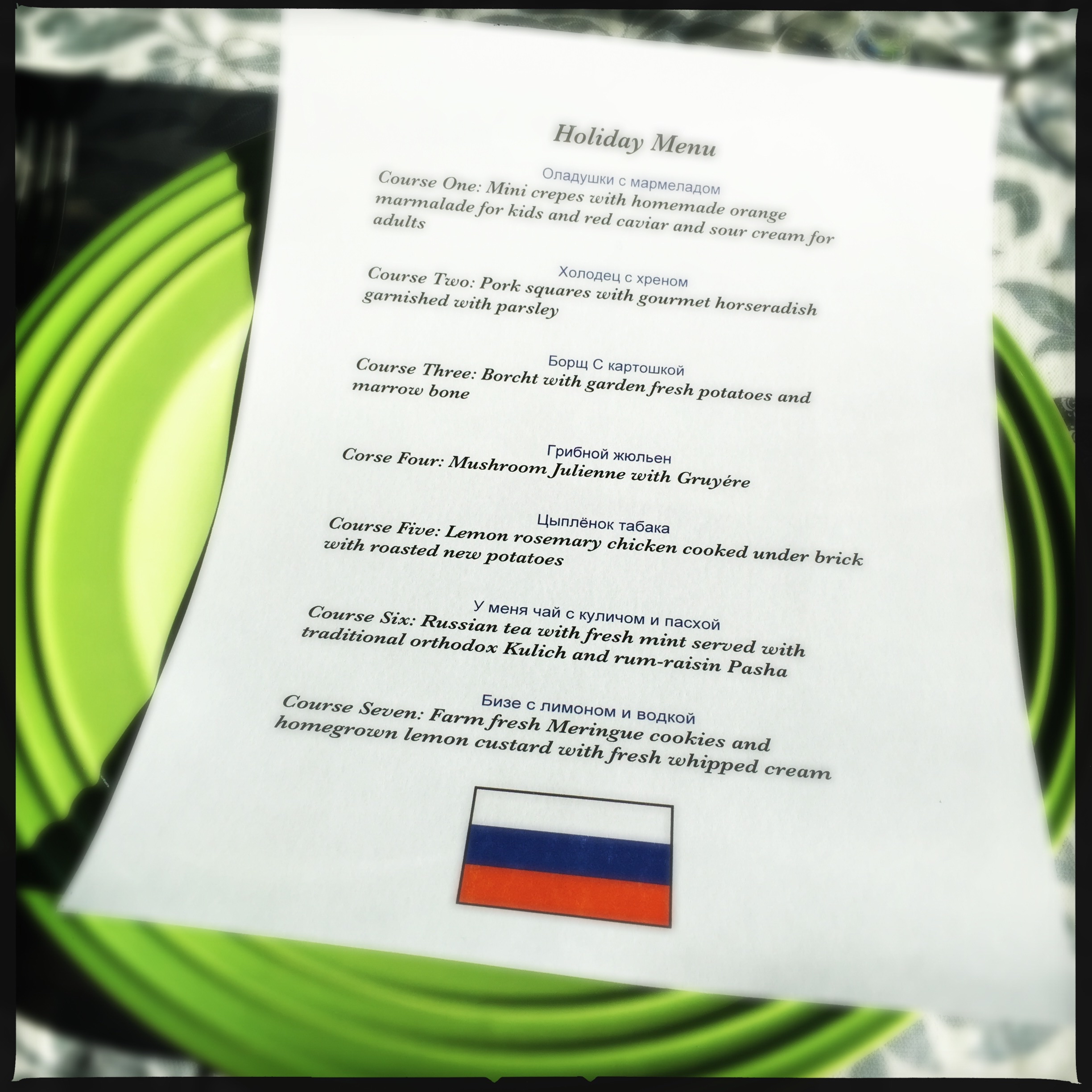 Olga, as it turned out, had gone all out for Пасха. Her three sons — Max, Leo and Asa — had joined in the excitement. “We need to make menus!” they’d suggested. And there on the table they were: menus — seven courses!