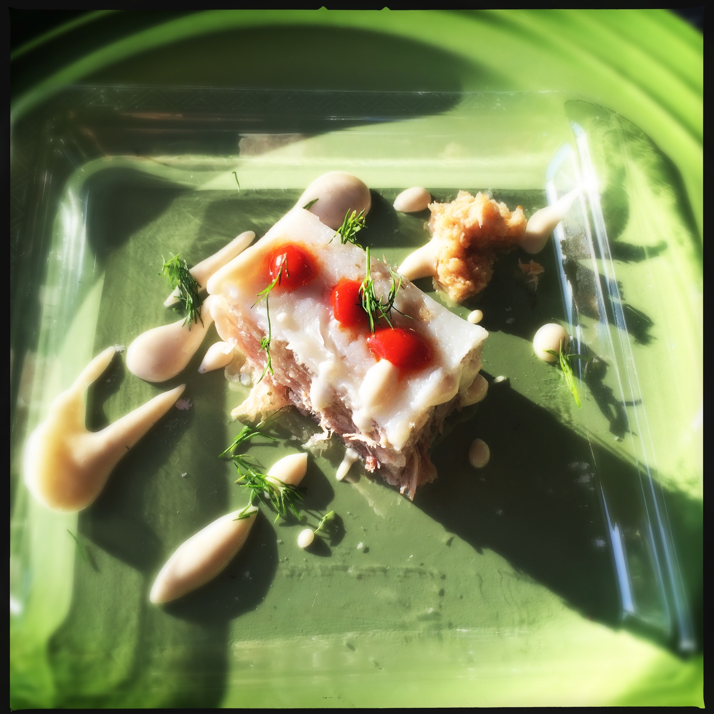 Next up was an exquisite gelled cube of chilled pork with horseradish, which was my favorite course of the evening.
