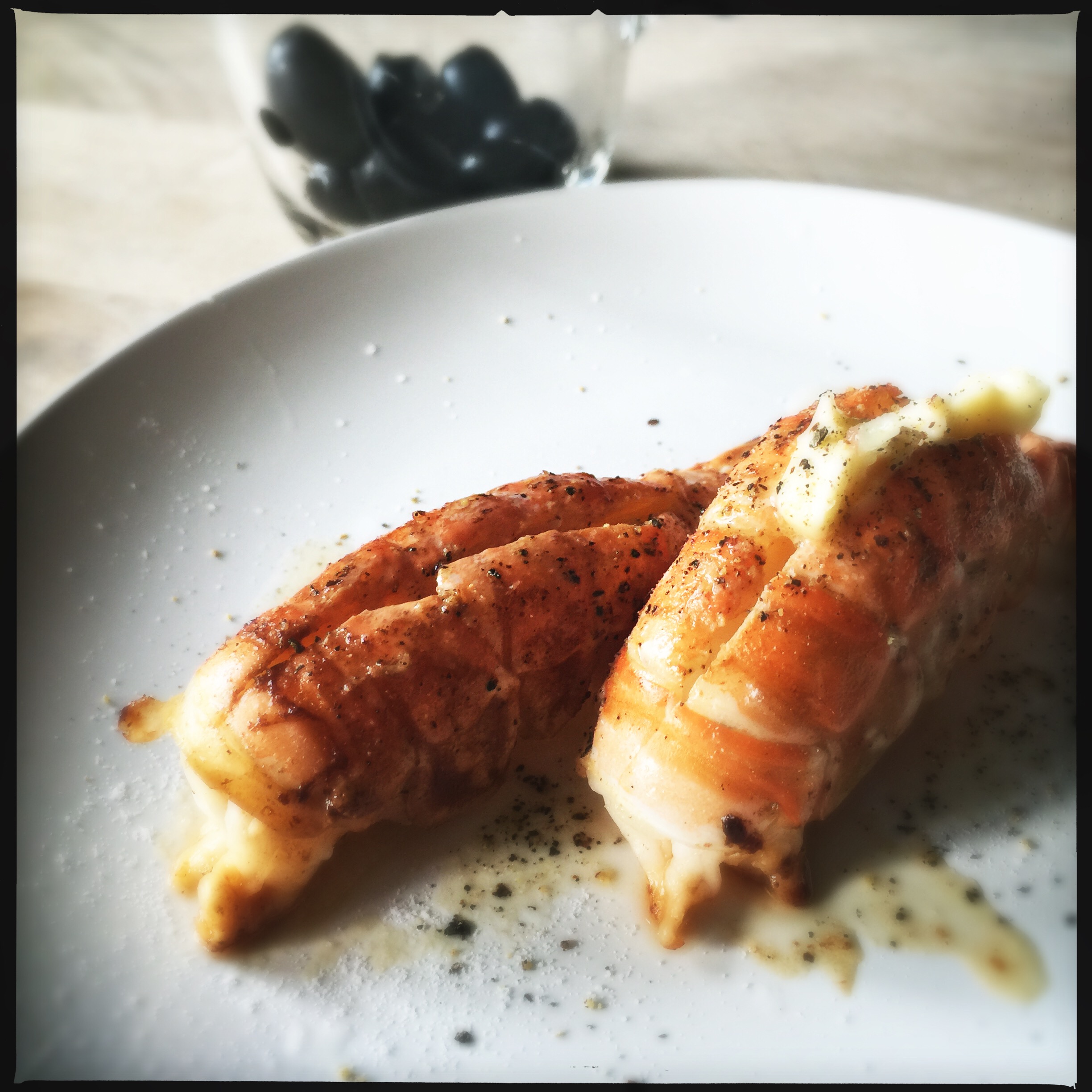 Later that evening, after another dozen malpeque oysters and a beer, plus a baguette and some foie gras and stinky cheese, I cooked up a couple simple langoustines with browned butter and lemon. My wife was still full from the poutine, so I got most of hers.