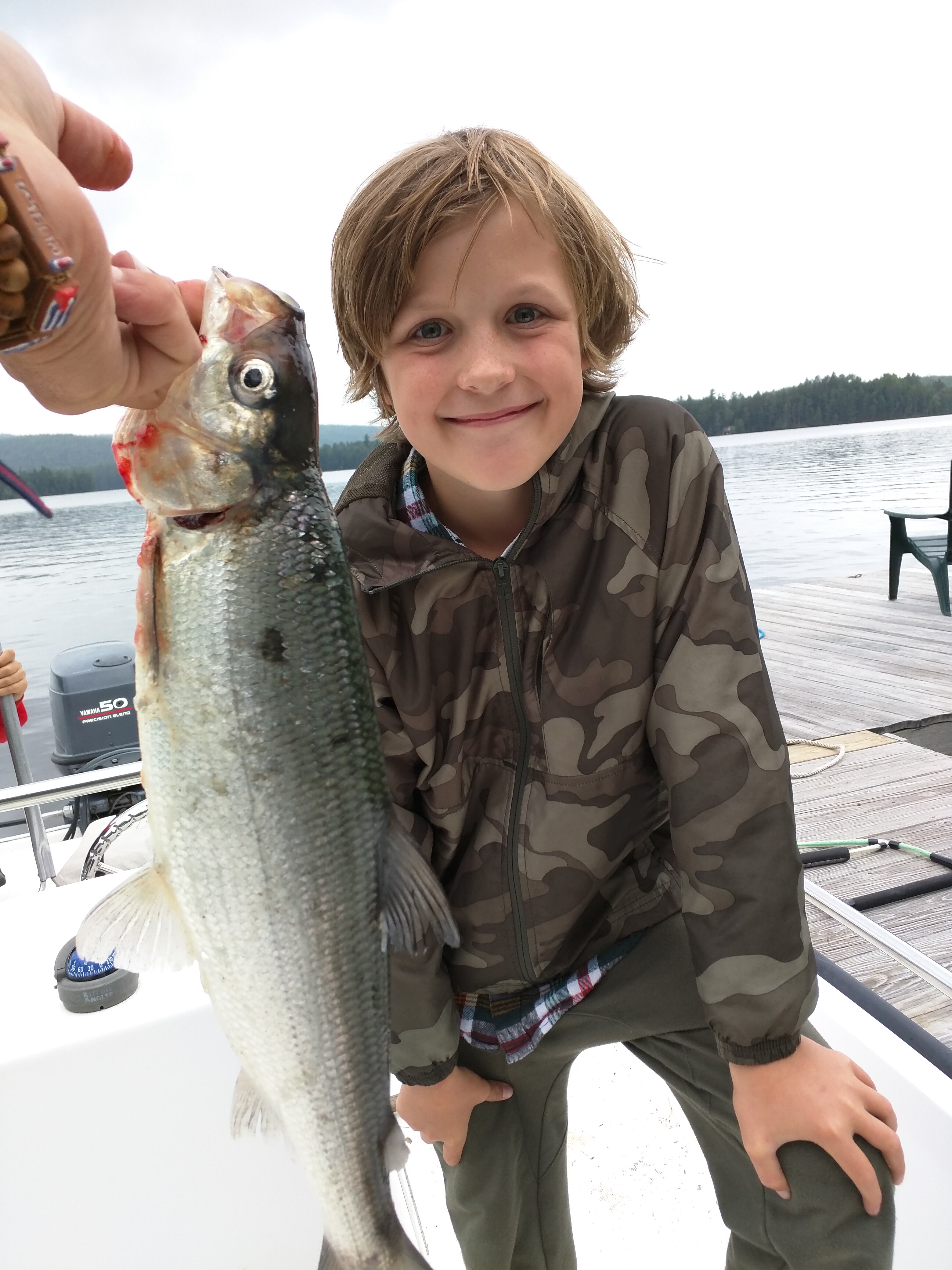 The following evening, after whipping the kids about the lake on a tube and exploring more of the surrounding woods in search of glacial erratics, I cooked my planned dinner. Jon had taken the boys out fishing, and they’d come back with two beautiful fish — a yellow walleye, and a mystery fish.