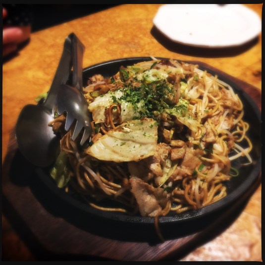 It sounded a little heavy for us, having indulged earlier on a 7-11 feast of fried chicken and croquettes. So we opted for a Hiroshima-style salad and Hiroshima-style yakisoba noodles. I’m not sure if the beer and edamame we got were Hiroshima-style — they just seemed like the usual.