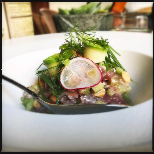 This is followed by two ceviches — both yellowfin tuna — one encased in a fresh green chili with a sour passion fruit salsa, the other with peanuts, unusual Oaxacan herbs and a serrano chili emulsion. They are both delicious. Grasshoppers, though listed in the menu description, are mercifully hidden in the jicama tacos with huitlacoche (corn fungus) and Oaxacan cheese. It is the best dish of the afternoon, something the likes of which I might expect to find in a Michelin-starred restaurant.