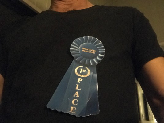 There was much “ooo”ing and “ahh”ing amidst the inhaling of chili and gulping of beer. The chili was superb, perhaps my best ever. And maybe this year, I would’ve actually won! And then, when it was all done and the plastic was cleared, my children appeared from a back room with a big paper blue ribbon inscribed with my name and First Place — “Best Chile”. I dabbed my misty eyes, hugged everyone in the house, and overlooked the misspelling. I had won with the audience that counted the most.