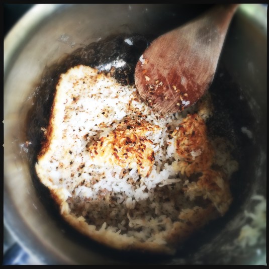 I’m making sushi rice. My sushi rice preparation technique, adapted from a recipe by Nobu Matsuhisa, involves bringing the rice to a boil, cooking it for five minutes at a regular temperature, then blasting it even more briefly with high heat, and then turning it off and letting it steam for 15 minutes. Where I go astray is usually in the last step, where I turn the heat on high, and instead of waiting the minute it’s supposed to take, wander off to do something else. (For example, the idea for this post came as I was working on another post when I suddenly smelled the rice burning.) More