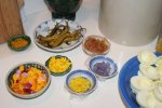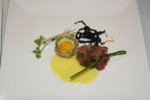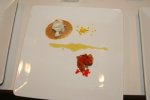 Here are some photos of my annual New Year’s Eve dinner. Another important tip for students is to have your mise en place in place before you begin. More about that in another post. I’ve included a shot of my NYE mise en place. All the “beautification” of these dishes involved relatively simple steps — a few flower petals, a drizzle of sauce, etc.