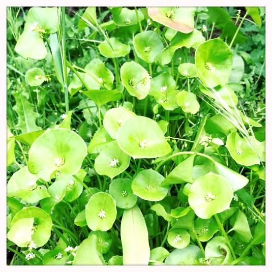 One of my favorite wild foods in our area is miner’s lettuce, a beautiful, delicate green that presents a lovely addition to a salad. Sometimes, when I am nerding out or doing an expensive dinner for a client, I will pick the little circular cups, and fill them with something exquisite and delicious — a mini salad, perhaps; or caviar.