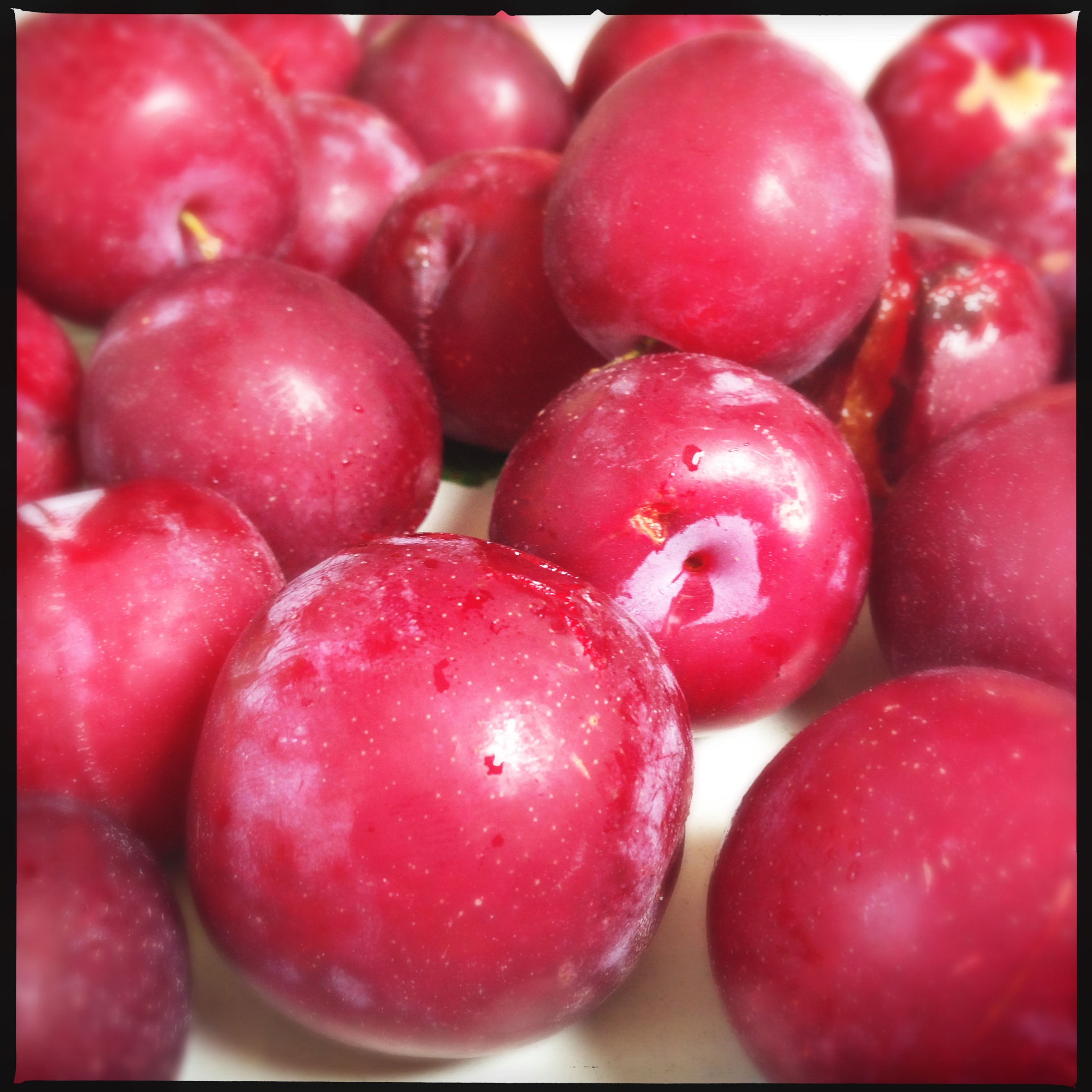 About this time every year, we get the call from next door. “The plums are ready!” The kids and I head over and wind our way down into the Watermans’ terraced backyard, where sure enough the plum tree is overloaded with beautiful purple plums. And we gather and gather and gather.